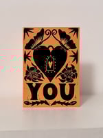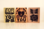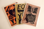 Three linocut designs handprinted with oil-based ink. White envelopes included.
